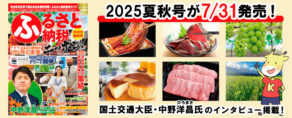 「ふるさと納税ニッポン!2025夏秋号」が発売されることになりました。今号では、中野前国土交通大臣からのインタビューを始め、ふるさと納税の制度を司る総務省からお話しを伺いましたので、是非ご覧ください。ご購入はこちら